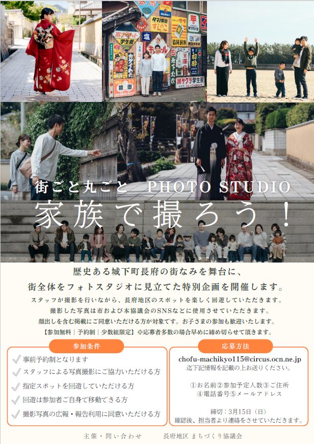 歴史ある城下町長府の街並みを舞台に、街全体をフォトスタジオに見立てた特別企画を開催いたします。スタッフが撮影を行いながら、長府地区のスポットを楽しく回遊していただけます。